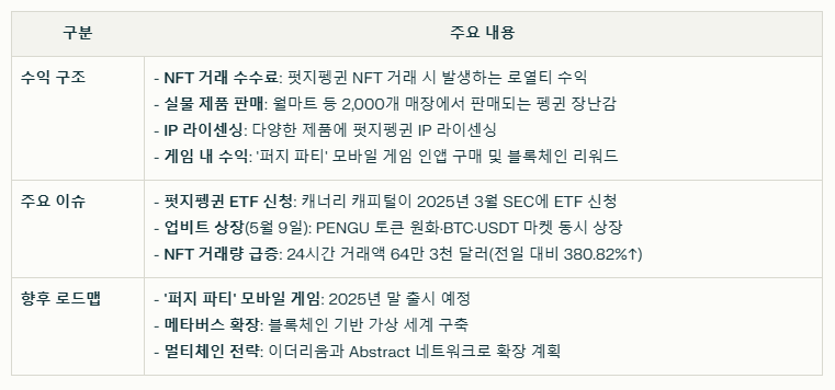 | PENGU (펏지펭귄) | NFT 기반, 실물 제품 연계, 솔라나 체인 | 실물 경제 진출, 높은 커뮤니티 참여도, 낮은 진입 비용 | NFT 시장 변동성, 법적 규제 리스크 |
